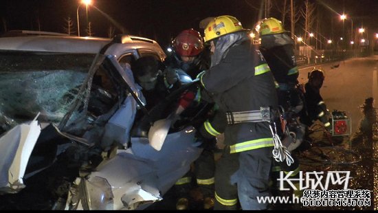 秦皇島:轎車夜間撞上電線桿 消防官兵緊急救援