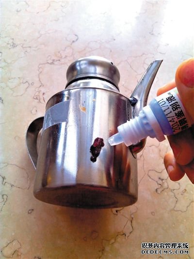 將鑒別液滴到不銹鋼油壺上1分鐘后,油壺表面被腐蝕成棕褐色,且用水沖洗不掉。