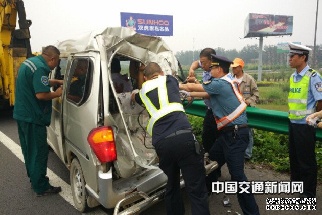 7月22日11時(shí)28分,在沈陽方向K276+100處的事故現(xiàn)場(chǎng),京秦支隊(duì)秦皇島大隊(duì)執(zhí)法人員姜大亮,正與其他救援人員一起,把受傷乘客從事故車中搶救出來。當(dāng)日上午,秦皇島大隊(duì)執(zhí)法人員高煥新、姜大亮,在巡查至沈陽方向K276+100處時(shí),發(fā)現(xiàn)一輛貨車與一輛面包車發(fā)生了追尾事故,雖然現(xiàn)場(chǎng)無路損,但是,經(jīng)現(xiàn)場(chǎng)調(diào)查,倆執(zhí)法人員發(fā)現(xiàn):被追尾的面包車?yán)?,有三人受傷,該車后排座椅竟然還卡住了2名受傷乘客,情況緊急。