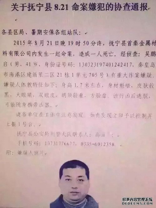 秦皇島撫寧8.21命案嫌犯在逃 市民看到他請(qǐng)舉報(bào)