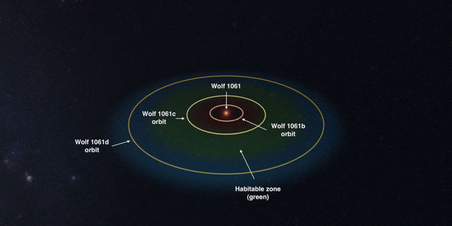 Wolf 1061c圍繞沃爾夫1061運(yùn)行 位于圖中蛇夫座所處天空位置。 Wolf 1061 b每隔5天就圍繞Wolf 1061運(yùn)轉(zhuǎn)一圈,質(zhì)量是地球的1.4倍。Wolf 1061 c每隔18天圍繞Wolf 1061運(yùn)轉(zhuǎn)一圈,質(zhì)量是地球的4.3倍。Wolf 1061 d每隔67天圍繞Wolf 1061運(yùn)轉(zhuǎn)一天,質(zhì)量是地球的5.2倍。3顆行星中,只有Wolf 1061c位于“適居帶”,意味著其中可能有流動(dòng)的水,甚至有生命存在。 萊特表示,這個(gè)發(fā)現(xiàn)特別令人興奮,因?yàn)閃olf 1061非常穩(wěn)定,不像大部分的紅矮星十分活躍,會(huì)發(fā)生X射線(xiàn)爆閃和超級(jí)火焰,不利生物存活。行星的穩(wěn)定性是關(guān)鍵因素,可依此判斷圍繞其運(yùn)轉(zhuǎn)的行星上,是否能存活生命。 萊特說(shuō),Wolf 1061就像太陽(yáng)一樣,甚至比太陽(yáng)更穩(wěn)定,可能是非常古老的星系。它的質(zhì)量只有太陽(yáng)的1/4,表面溫度約攝氏3100度,只有太陽(yáng)的一半,3顆圍繞它的行星地表應(yīng)是崎嶇巖石。