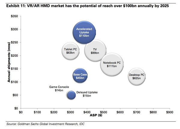 而國內的發(fā)展勢頭也絲毫落下,甚至是更為火熱,傳統(tǒng)硬件公司、互聯(lián)網巨頭與創(chuàng)業(yè)者們爭相入局。當前國內已有諸如暴風魔鏡、蟻視科技、靈境VR(樂視投資)、樂相科技、驍龍科技、拓視科技(魅族投資)、經偉度的Three Glasses、眼界的EMAX、UCglasses等等公司。互聯(lián)網與硬件公司諸如騰訊、小米、魅族、樂視等亦是紛紛通過資本入局。 然而這僅僅只是VR火熱的冰山一角。據火焰工廠CEO婁池介紹:僅僅就在中國,就一下子涌現(xiàn)出200多家各種VR創(chuàng)業(yè)公司,市場上現(xiàn)在能看到100多個眼鏡盒子,每星期至少2個VR產品發(fā)布。要是算上北美和歐洲的項目,加起來至少有400多個創(chuàng)業(yè)公司在廝殺。 那么是什么力量促使VR這一成熟程度遠未達到當前智能手機成熟高度,需要攻克的技術難點更是不勝枚數的產業(yè)在此時呈現(xiàn)出如此狂熱之勢?或許從以下幾個方面可以解釋。 二、十年內千億級年營收規(guī)模,虛擬現(xiàn)實技術具備極大的發(fā)展?jié)摿?/span> 虛擬現(xiàn)實技術因其廣泛的應用范圍、交互模式的變革、沉浸式使用體驗、被許多人認為是下一個大發(fā)展的風口所在。眾多機構也預測,未來VR產業(yè)市場規(guī)模有望在十年到十五年內突破萬億大關,硬件設備、娛樂內容、跨界服務三大投資機會將不斷顯現(xiàn)。 在此前高盛發(fā)布的一項長達58頁,詳細討論虛擬現(xiàn)實(VR)和增強現(xiàn)實(AR)產業(yè)的未來發(fā)展狀況的研究報告中預測:VR和AR擁有巨大的潛能,它可能會成為下一個大型計算平臺,不論是VR還是AR都有能力發(fā)展成年營收數百億美元的產業(yè),它可能會像電腦的出現(xiàn)一樣影響深遠。報告顯示,到2025年AR和VR硬件軟件營收將達800億美元,如果它們迅速跳出小眾市場走向大眾,年營收最多可以達到1820億美元。作為對比,平板電腦市場營收預計為630億美元,臺式機預計為620億美元,游戲機預計為150億美元。