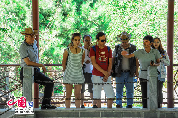 (中外記者認(rèn)真聽導(dǎo)游講解)
