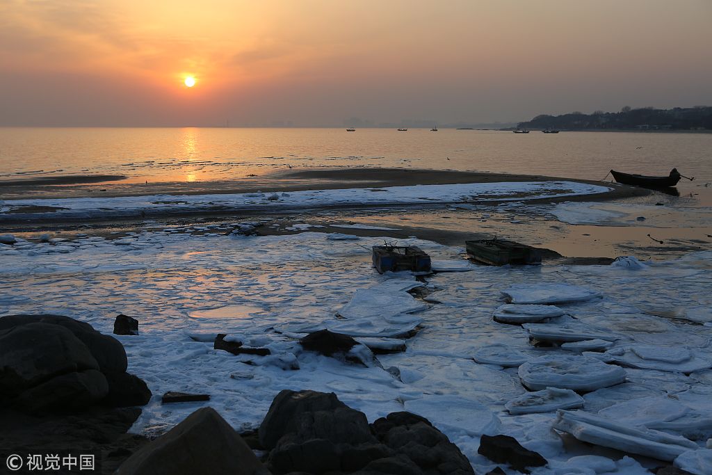 “四九”第一天北戴河,盡管今年海冰的規(guī)模不是很大,但夕陽(yáng)下海冰還是別具特色的一道風(fēng)景。圖片來(lái)源:丹尼/視覺(jué)中國(guó)