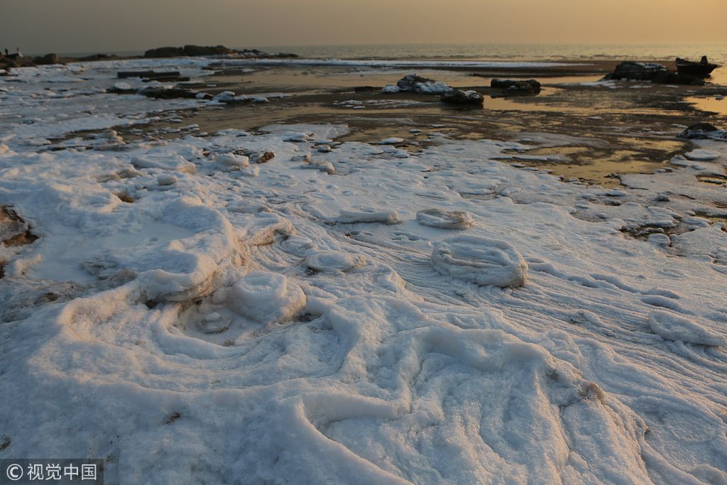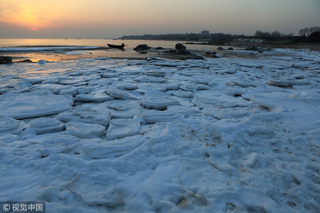 2018年1月18日,河北秦皇島,“四九”第一天北戴河,盡管今年海冰的規(guī)模不是很大,但夕陽(yáng)下海冰還是別具特色的一道風(fēng)景。圖片來(lái)源:丹尼/視覺(jué)中國(guó)