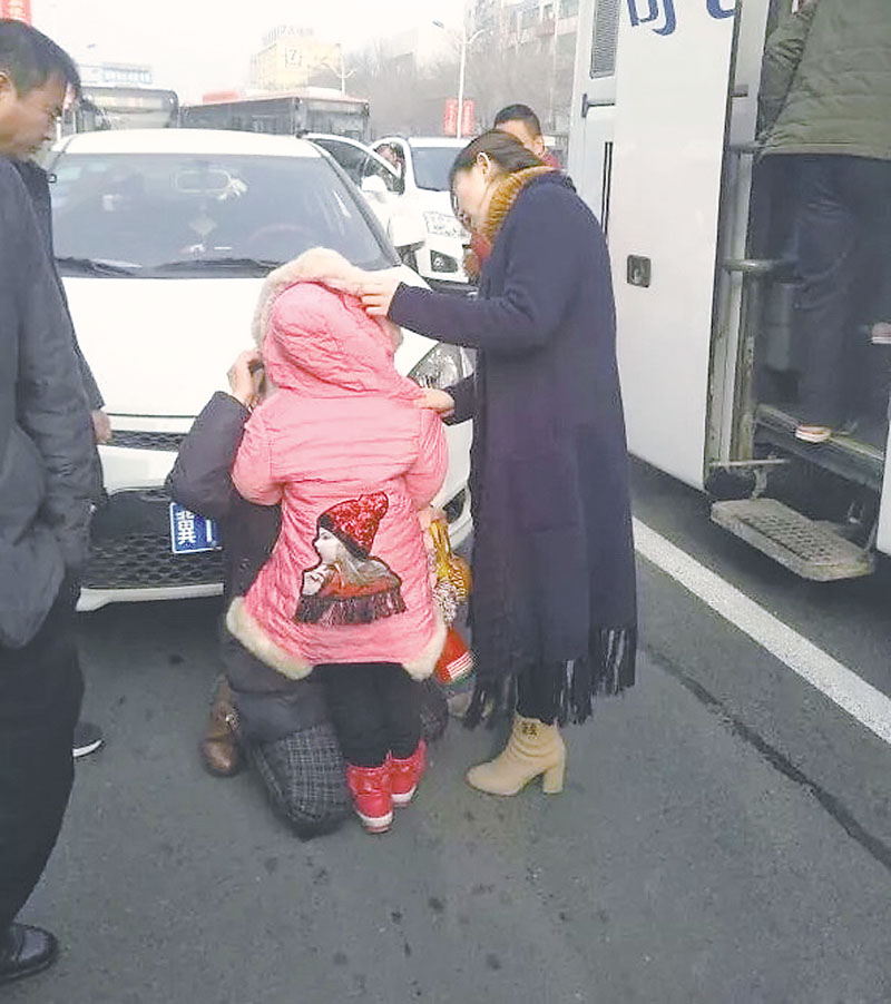 衡水街頭:小女孩被卡轎車車底 秦皇島大巴乘客抬車救人。圖片由于志蕾提供