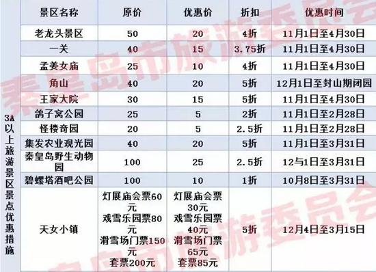 秦皇島市旅游委發(fā)布最全秦皇島春節(jié)期間吃、住、游打折信息,包括鴿子窩、老龍頭等旅游景區(qū)門票最低兩折起,票價(jià)低至5元;山海假日酒店等星級(jí)酒店住宿價(jià)格最低兩折起,標(biāo)間最低