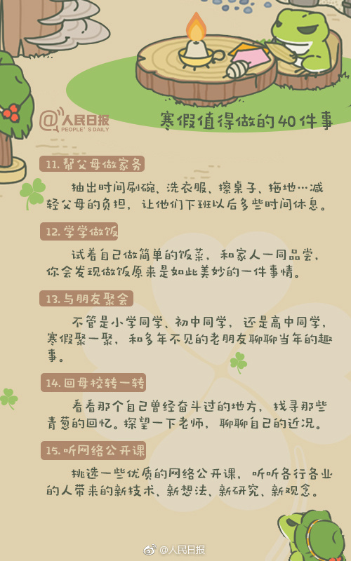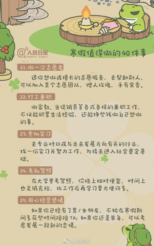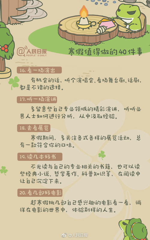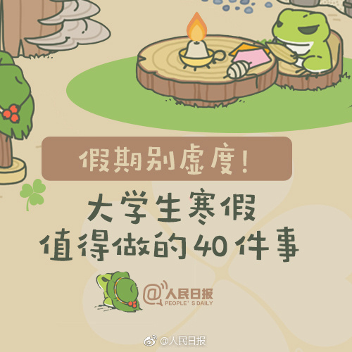 寒假模式陸續(xù)開啟,你的假期打算怎么過?大學(xué)的精彩不只是校園生活,假期也要過得充實(shí)有意義。好好陪陪家人、學(xué)習(xí)一門新語言、考取駕照、看幾部好電影、列一份讀書清單…無論你即將步入大學(xué),還是在讀大學(xué)生,這40件事,都值得參考↓↓這個假期,不虛度!