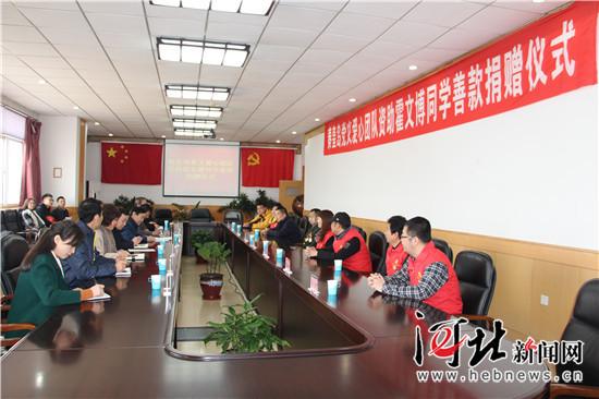 3月12日,沈汝波愛心團(tuán)隊(duì)秦皇島市黨義愛心團(tuán)隊(duì)為河北科技師范學(xué)院患病學(xué)生霍文博捐款。 河北科技師范學(xué)院供圖 河北新聞網(wǎng)訊(記者張輝)新學(xué)期開學(xué),一場(chǎng)突如其來的疾病讓河北
