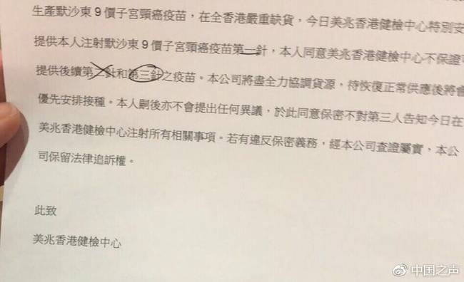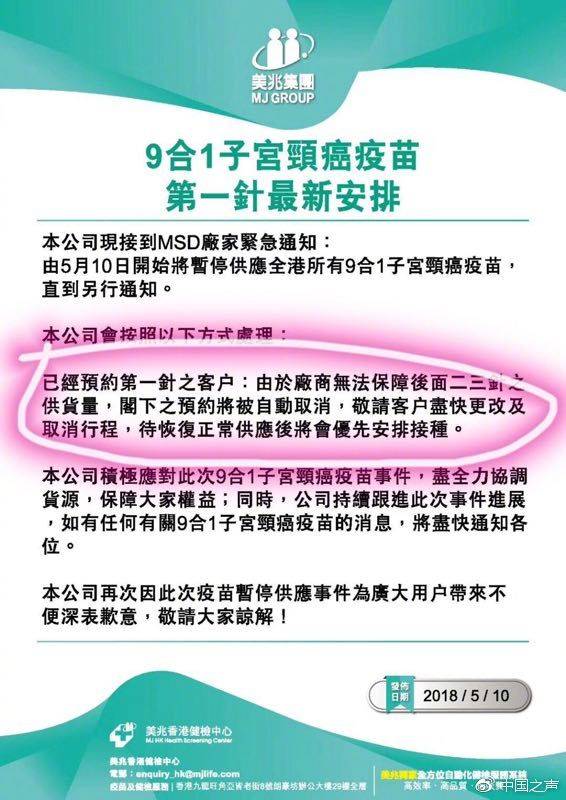 有數(shù)據(jù)顯示,內(nèi)地已經(jīng)有200萬左右的消費(fèi)者選擇前往香港注射九價(jià)宮頸癌疫苗。龐大的市場需求也催生了“內(nèi)地女性赴港打疫苗”的產(chǎn)業(yè)鏈。 九價(jià)宮頸癌疫苗一共分3期注射,每期注射一針。但近日香港多家醫(yī)療機(jī)構(gòu)發(fā)布通知稱,已經(jīng)接到默沙東藥廠正式通知,暫停向全港供應(yīng)九價(jià)宮頸癌疫苗。不少已經(jīng)打了第一針、第二針的消費(fèi)者被告知:要么取消,要么延期,無法保證此后一到兩針的供應(yīng)。 然而,記者調(diào)查發(fā)現(xiàn),在“疫苗告急”的通知發(fā)布之后,有香港醫(yī)療機(jī)構(gòu)仍在給部分客戶打“第一針”,明明存貨有限,卻還在服務(wù)新客戶。部分“赴港打疫苗”中介也在招攬新客戶。這究竟是什么原因?消費(fèi)者的權(quán)益如何維護(hù)?緊張的供需矛盾又是否會滋生“地下市場”? 客戶已交全款,但醫(yī)療機(jī)構(gòu)稱無法保證疫苗有貨 美兆香港體檢中心5月10號發(fā)布通知稱,已經(jīng)預(yù)約第一針的客戶,由于廠商無法保障之后的第二、第三針的供應(yīng)量,客戶的預(yù)約將被自動取消,請客戶盡快更改或取消行程。然而,內(nèi)地的邱女士向中國之聲記者提供了相關(guān)單據(jù)圖片,圖片顯示,在美兆發(fā)布通知之后的5月11號,美兆香港體檢中心還是為邱女士提供了接種“第一針”疫苗的服務(wù),還預(yù)約了第二針的日期,預(yù)約時(shí)間為2019年1月。