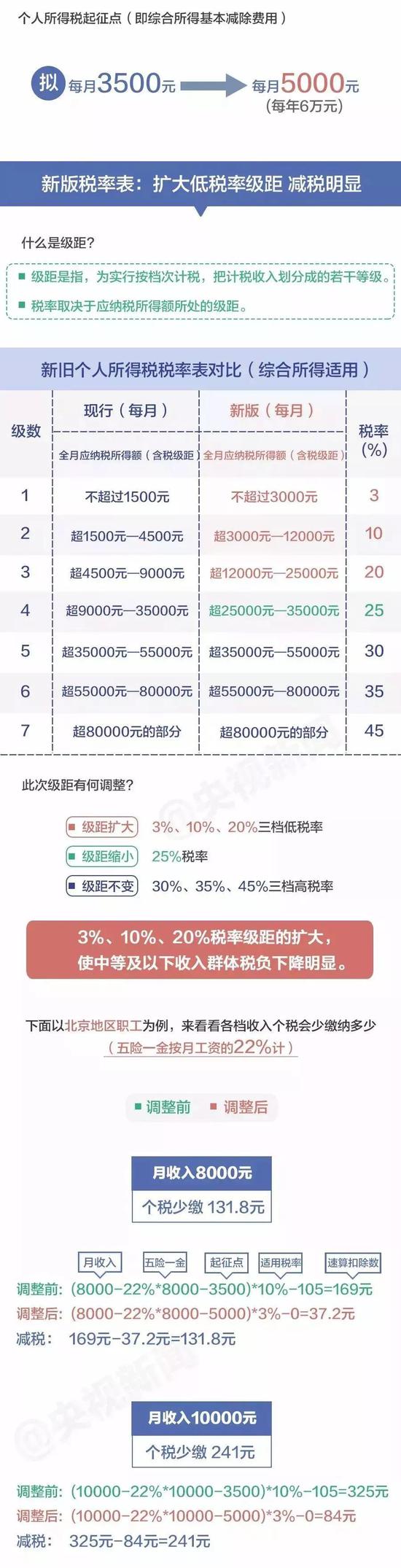 “起征點(diǎn)”上調(diào),稅率結(jié)構(gòu)優(yōu)化調(diào)整,一系列改革動作后,你每月將會少繳納多少錢?一張圖看懂↓