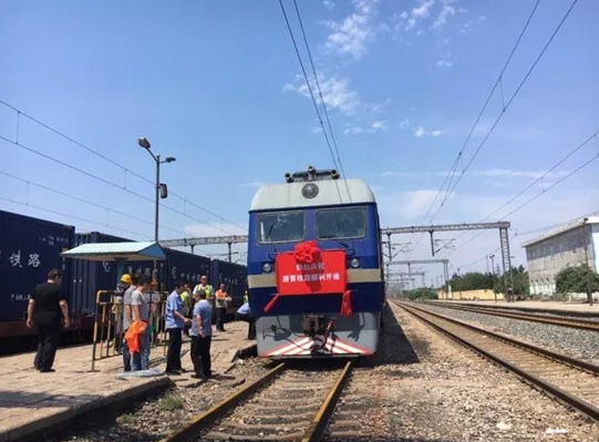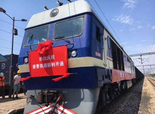 6月30日14:00,隨著唐山市委副書記、市長丁繡峰宣布唐曹鐵路全線開通,首趟列車發(fā)車!,一列車頭懸掛熱烈慶祝唐曹鐵路順利開通,兩側(cè)懸掛唐曹鐵路開行首趟列車標(biāo)語的貨運(yùn)列車徐