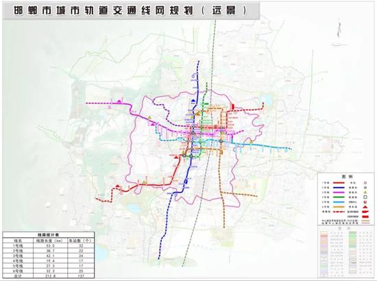 線網(wǎng)規(guī)劃概況:邯鄲市軌道交通線網(wǎng)由6條線組成,全長212.8km,共設車站137座,車輛基地6處,停車場6處??刂浦行?處,主變電所8座。