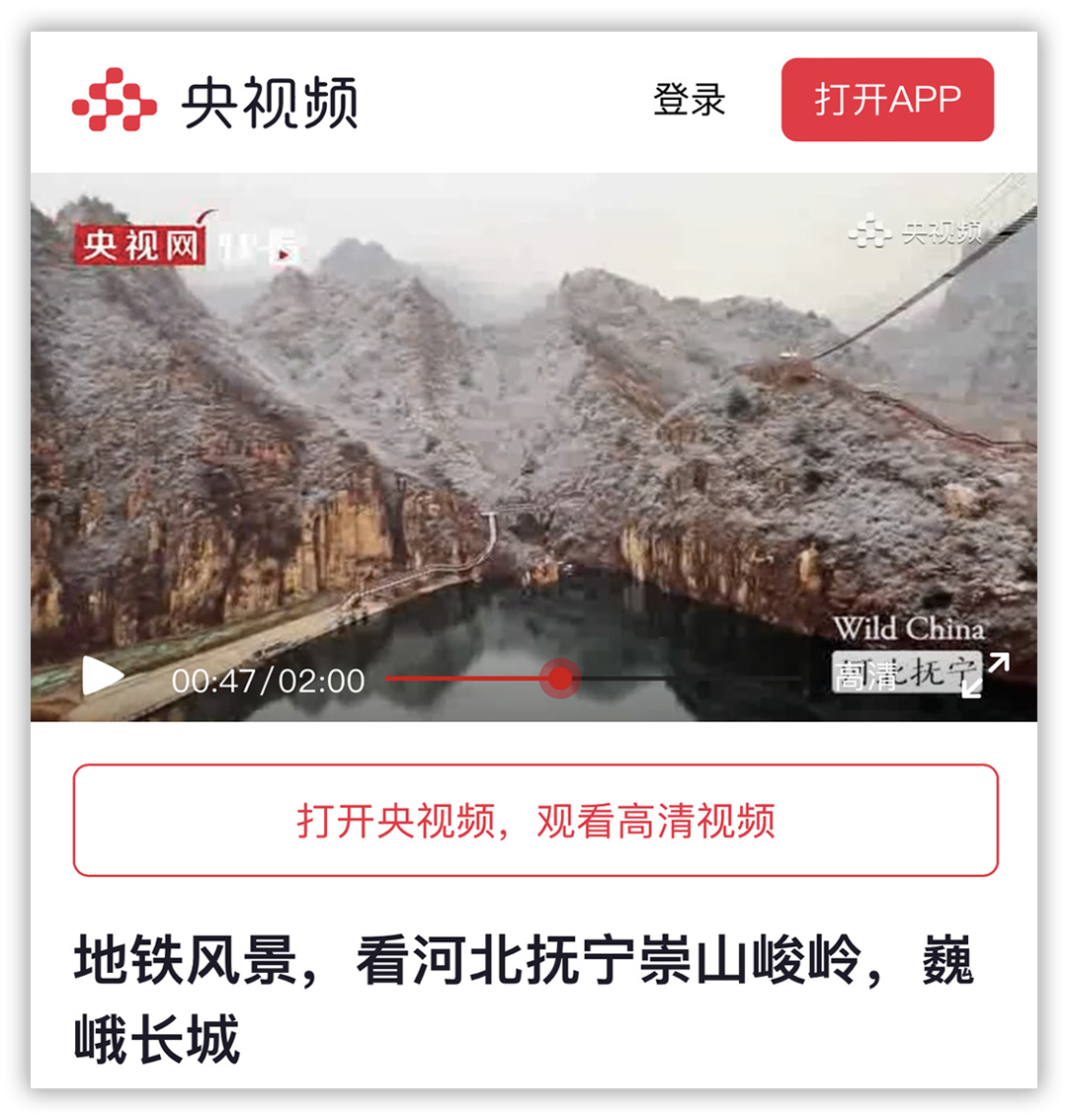 超贊!近日 ,大美中國冬日風(fēng)光選播 河北秦皇島撫寧冰塘峪長城風(fēng)情大峽谷 絕美冰雪奇峰美景! 冰塘峪超美雪景上央視CCTV1啦 這是冰塘峪美景在央視新聞平臺(tái)河北總站、央視頻大美